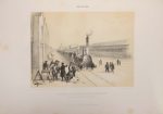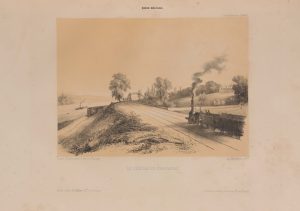 Les 4 premières planches portent le timbre à sec " Collin et Cie éditeurs ". Album paru à l'occasion de l'inauguration de la ligne Paris-Orléans, mise en service par la Compagnie du chemin de fer de Paris à Orléans (PO). Jolis paysages dessinés et lithographiés par Champin et imprimé par Rigo, montrant les bureaux de l'administration de la compagnie et les localités, alors rurales, de Juvisy, Ivry-sur-Seine, Vitry, Evry, etc., placées sur le tracé de la ligne, ainsi que des vues de monuments tels que le château de la princesse d'Eckmül à Savigny, le viaduc sur la rivière de l'Yvette, le château du comte de Talaru à Chamarande, etc. Les paysage sont quelques fois occupés par des personnages représentés dans leurs activités quotidiennes ; une scène figure la formation d'un train à la gare de Paris. Les deux dernières vues permettent de comparer Paris à des époques différentes : l'une reconstitue la ville trois siècles auparavant, avec l'enceinte d'Etienne Marcel, l'autre la représente au XIXe siècle, lors de l'établissement des chemins de fer. Jean-Jacques Champin, né à Sceaux en 1796 et mort à Paris en 1860 fut l'élève de Félix Storelli et Auguste Régnier. Il exposa aux salons parisiens de 1819 à 1859, où il fut récompensé en 1824 et 1831 ; peintre, aquarelliste et lithographe, il s'illustra dans le domaine de la représentation religieuse et des scènes de genre ; il est surtout connu pour ses paysages et ses vues urbaines (Benezit). Étiquette ex-libris de la bibliothèque du château de Val Cognatrix (Saint-Germain-les-Corbeil) du papetier Paul Darblay, qui racheta les papeteries d'Essonnes dans les années 1860.
