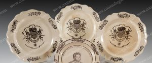 devises « Vivre Libre ou Mourir - La Constitution ou la mort - La Nation, la Loi et le Roi ». Usures du temps, taches. Travail de la manufacture de Longport (Staffordshire), sous la direction d'Edouard Bourne, vers 1791. Sans marque apparente. Diam.: 25 cm. Référence : une assiette similaire se trouve au Musée Carnavalet (inventaire C115).