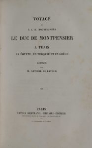 LATOUR (Antoine de). Voyage de S.A.R. Monseigneur le duc de Montpensier à Tunis, en Egypte, en Turquie et en Grèce. Lettres. Paris, Arthus Bertrand, [1847]. In-8, demi-chagrin chocolat, dos lisse romantique, auteur et titre doré (rel. frotée et...