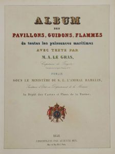 LE GRAS (Alexandre). Album des pavillons, guidons, flammes de toutes les puissances maritimes. Paris, Dépôt des Cartes et Plans de la Marine (chromolith. Auguste Bry), 1858. In-4, [7] f. (dont le titre en chromolith. et un f. d'errata sur papier...