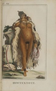 Rare exemplaire avec les planches simples en coloris d'époque : elles représentent des indigènes, dont une Hottentote nue exhibant son " tablier ", " point très-intéressant d'Histoire Naturelle & de l'Histoire " sur lequel l'auteur glose volontiers ; il le premier explorateur français à fournir une description précise de cette particularité physique et à la considérer comme le résultat d'une coutume. Les autres planches figurent deux girafes, l'une mâle, l'autre femelle.