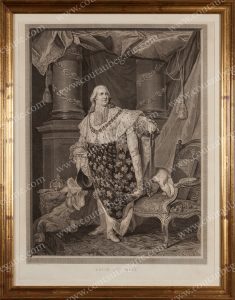 LOUIS XVIII, roi de France (1755-1824). Gravure signée F. A. David, datée 1815, représentant le souverain en tenue du sacre posant près de la Charte de 1814, conservée dans un encadrement moderne en bois doré. Bon état. A vue : H. : 67 cm - L....