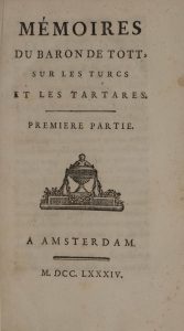 TOTT (baron de). Mémoires sur les Turcs et les Tartares. Amsterdam, s.n., 1784. Quatre parties en 2 vol. in-8, veau époque, dos lisse, titre doré, pièce de tomaison verte, caissons ornés (coiffe sup. arrachée, frottements, coins émoussés,...