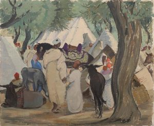 Suzanne DROUET-REVEILLAUD (1885-1970). Le campement marocain. Huile sur toile, signée en bas à droite. Etiquette au dos sur le châssis, salon des Indépendants 1950, titré le campement marocain. 60 × 73 cm. (Enfoncements, toile distendue).