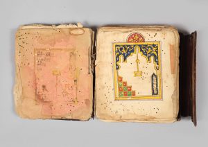 f. 3v : cartouche à décor d'entrelacs entre deux liserés rouges, formule de bénédiction adressée au Prophète, lettres coufiques évidées sur fond bleu, rehauts rouges ; accompagné en marge externe d'une rosace à l'encre bleue, rose et or.