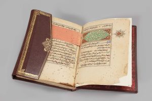 d'un double-filet rouge et bleu. Élégante calligraphie rehaussée de titres de sections et ornements géométriques à l'encre bleue, verte et rose.