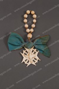ORDRE DU SAINT-ESPRIT. Dizainier en ivoire sculpté, surmonté d'un ruban en soie moirée bleu ciel. Petits manques et accidents, mais bon état général. Travail français, du XIXe siècle. H. : 7 cm - L. : 7, 5 cm.