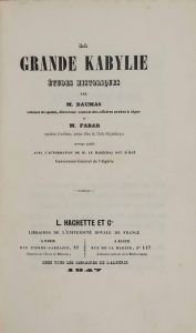 DAUMAS (Eugène), FABAR (Paul Dieudonné). La grande Kabylie. Études historiques. Paris, Hachette, 1847. In-8, demi-basane verte, dos lisse romantique, titre doré (épidermures, coins et coiffes émoussés). Provenance : Bibliothèque orientale...