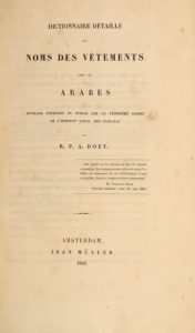 DOZY (P.A.). Dictionnaire détaillé des noms des vêtements chez les Arabes. Amsterdam, Jean Müller, 1845. Grand in-8, demi-chagrin rouge, dos à 5 nefs, auteur et titre dorés (lég. frottements, rares rousseurs). Édition originale. Provenance :...