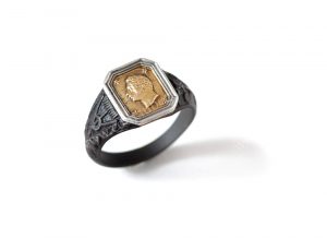 LOUIS-ANTOINE, Dauphin de France, duc d'Angoulême (1775-1844). Bague commémorative de la mort du prince, en acier, ornée d'un profil ciselé en métal doré dans un encadrement argent. Usures du temps, bon état général. Travail français du...