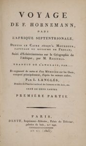 HORNEMANN (F.). Voyage de F. Hornemann dans l'Afrique septentrionale, depuis le Caire jusqu'à Mourzouk.. Suivi d'éclaircissemens sur la géographie de l'Afrique, par M. Rennell. Traduit de l'anglais… et augmenté de notes et d'un Mémoire sur les...