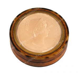 MARIE-THERESE, duchesse d'Angoulême. Boîte ronde en loupe de buis, ornée sur le couvercle d'un médaillon en carton repoussé, signé Michaud, représentant un profil de la princesse la tête tournée vers la droite, sous verre bombé. Bon état....