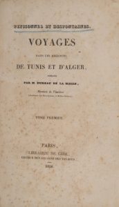 PEYSSONNEL (J.A.), DESFONTAINES (R.L.). Voyages dans les régences de Tunis et d'Alger. Paris, Librairie de Gide, 1838. 2 vol. in-8, demi-basane verte, dos lisse, auteurs et titre dorés (frottements, rousseurs). Première édition illustrée de 6...