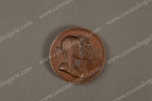 HENRY, du duc de Bordeaux (1820-1883). Belle médaille commémorative, souvenir de la naissance du prince en bronze signé Andrieu, ornée sur une face du double profil du duc et de la duchesse de Berry et au dos gravé de la date du 29 septembre...