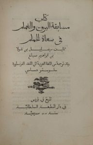 SABBAGH (Michel). La colombe messagère plus rapide que l'éclair, plus prompte que la nue. Traduit par Silvestre de Sacy. Paris, Imprimerie impériale, an XIV = 1805. In-8, cartonnage rouge à la Bradel, pièce de titre verte (coiffe sup. arrachée,...