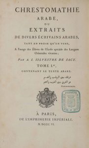 SILVESTRE DE SACY (A.I.). Chrestomathie arabe ou extraits de divers écrivains arabes … à l'usage des élèves de l'École spéciale des langues orientales vivantes. Contenant le texte arabe. Paris, Imprimerie impériale, 1806. 3 vol. in-8,...