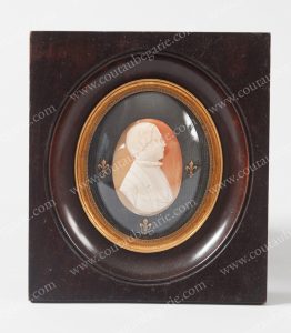 HENRY V, comte de Chambord (1820-1883). Médaillon contenant un camée sculpté au profil du prince, conservé dans un encadrement en bois noirci, cerclé de laiton doré, sous verre bombé. Avec attache de suspension au dos. Bon état. Travail...