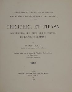 - DUVAL (Paul-Marie). Cherchel et Tipasa. Recherches sur deux villes fortes de l'Afrique romaine. Paris, Geuthner, 1946. In-4, demi-basane noire à coins, dos à 4 nerfs, auteur et titre doré [reliure artistique B. El-Lamrani, Meknes].