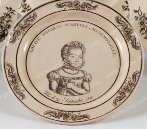 LOUISE, princesse de France, Mademoiselle d'Artois (1819-1864). Assiette en faïence fine à décor en grisaille d'un portrait à mi-corps de la fille du duc et de la duchesse de Berry, entourée de l'inscription « Louise Thérèse d'Artois,...