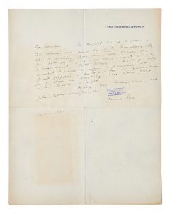 James JOYCE - 1882 - 1941 - Lettre autographe signée. Paris, 29 août 1921. 1 demi- page in-4 (26,9 x 20,9), papier vergé bleuté à l’adresse gravée « 71, rue du Cardinal Lemoine. Ve ».