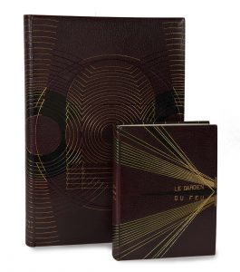 rayonnants ou concentriques dorés et à froid ou mosaïqués de maroquin ébène et beige, cadres intérieurs de même peau ornés de filets dorés et à froid, contre- gardes et gardes de soir mordorée, doublesgardes de papier marbré noir et doré, non rogné, couverture et dos, chemise de papier et étuis (Pierre Legrain).