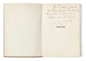 Détours : envoi autographe signé à Francis Gérard : « un livre dont il a peut- être rencontré le héros à la Cigale, aux Ch. Élysées » ;