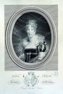 MARIE-AMELIE, reine des Français, née princesse des Deux-Siciles (1782-1866). Gravure signée Lugier, la représentant en buste, à l'époque où elle est duchesse d'Orléans, d'après un portrait peint par François Gérard. Au bas du document...