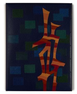 Maroquin bleu nuit, plats ornés d’une silhouette de couple enlacé mosaïquée de maroquin rouge, fauve, orangé et jaune, sur fond de pièces rectangulaires, parfois superposées, mosaïquées de maroquin en différentes nuances de bleu et de vert, dos lisse, fin cadre intérieur de box havane, doublures et gardes (encadrées de box havane) de nubuck vermillon, tranches dorées sur témoins, premier plat illustré de la chemise en simili- bois, couverture et dos, chemise demimaroquin bleu nuit à bandes et étui (Paul Bonet / 1962).