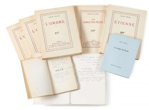 Édition originale. Un des 100 exemplaires réimposés au format in-quarto tellière sur papier vergé Lafuma- Navarre, réservés aux Bibliophiles de la Nouvelle Revue française (n° XL ; 1er papier).