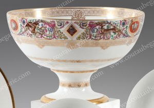 et le chiffre de LouisPhilippe. Fêles à l'intérieur mais bon état général. Travail de la Manufacture royale de Sèvres vers 1846. Marques en creux datées 1846, marque verte datée 1846, marque bleue datée 1847, marque or du château de Fontainebleau. H. : 14, 5 cm - Diam. : 21, 8 cm. Provenance : Service dit « ordinaire » commandé le 26 juin 1835 pour la table du roi Louis-Philippe au château de Fontainebleau, qui comportait à l'origine 2086 pièces de deux frises différentes, la seconde étant relativement moins riche à décor de feuillages et d'oiseaux. Cette jatte à fruit est l'une des deux de 1ère grandeur livrées le 24 septembre 1846, le service en comptait seulement six.