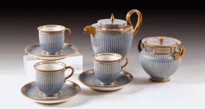 motifs géométriques et de filets or sur fond bleu agate, le bec de la théière est en forme de tête de lion en or mat. Accidents et restaurations. Travail de la Manufacture royale de Sèvres vers 1830-1832. Marques en creux datées 1830 et 1832, marques bleues datées 1835, marque des doreurs Moyez et Boullemier. Théière : H. : 16 cm - L. : 18 cm - Sucrier : H. : 10, 5 cm - L. : 12, 5 cm. Tasse : H. : 6, 8 cm - Soucoupe : Diam. : 13, 7 cm. Provenance : Service à thé de la famille royale pour les résidences de Saint-Cloud et Compiègne.