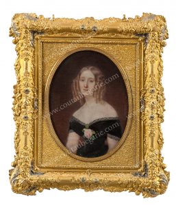 bas à droite et datée 1842. Conservée dans son cadre d'origine en bronze doré repoussé orné de fleurs, avec chaînette et attache de suspension. Miniature : H.: 13, 5 cm - L.: 10 cm. Cadre : H.: 23 cm - L.: 20 cm.