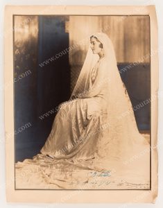ISABELLE, comtesse de Paris, née princesse d'Orléans-Bragance (1911-2003). Portrait photographique signé O'Doyé à Paris, la représentant le jour de son mariage, posant assise en robe de mariée, avec sa signature autographe au bas du document :...
