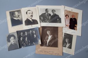 ; le duc et la duchesse de Guise entouré de leurs enfants par Taponier ; la princesse Isabelle d'Orléans, duchesse de Guise, avec au bas du document une dédicace autographe : « Pour mes chers petits enfants, Bernard et Yvonne, leur très affectionnée grand-mère, Isabelle, 1955» ; le prince Jean d'Orléans, duc de Guise, par R. Marchand à Bruxelles, avec au bas du document une dédicace autographe : « Pour mon cher Bunny, en exil, 27juin 1930, Jean» ; le prince Henri d'Orléans, comte de Paris, par Otto Pirou à Paris, avec au bas du document une dédicace autographe : « Pour Yvonne, avec mon amical souvenir, Paris, 20 février 1952, Henri », le prince Henri d'Orléans, comte de Paris, posant avec son épouse, avec au bas du document une dédicace autographe : « Pour Bernard et Yvonne, avec nos souvenirs très affectueux, Paris, 20 février 1952, Henri » ; le comte et la comtesse de Barcelone, avec au bas du document une dédicace autographe : « Pour Yvonne, souvenir très affectueux de Maria et Juan, 1979 ». On y joint deux cartes de vœux signées du prince Alphonso de Bourbon, datées 1973 et 1987 et un portrait photographique de la princesse Françoise d'Orléans, épouse du prince Christophe de Grèce (1902-1953), fille du duc et de la duchesse de Guise. En l'état. Format divers. Provenance : ancienne collection du comte Bernard (1925-1958) et à la comtesse Yvonne d'Harcourt.