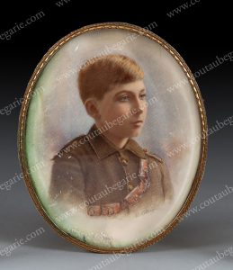 COLLINGS K. (école anglaise du début du XXe siècle). Portrait de Charles-Philippe duc de Nemours (1899-1993). Miniature sur ivoire signée en bas à droite, de forme ovale, conservée sous verre bombé dans un encadrement en métal argenté, avec...