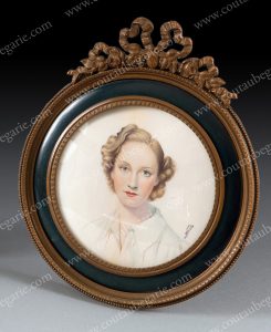 surmonté d'un nœud enrubanné, avec pied chevalet au dos et plaque d'identification en métal argenté. Bon état. A vue : Diam. : 8 cm. Cadre : Diam. : 12 cm. Provenance : ancienne collection du duc et de la duchesse de Nemours.