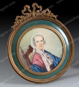 bronze doré surmonté d'un nœud enrubanné, avec pied chevalet au dos. Bon état. A vue : Diam. : 8 cm. Cadre : Diam. : 12 cm. Provenance : ancienne collection du duc et de la duchesse de Nemours.