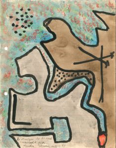 Au dos du dessin, la lettre évoque M. PAGANI de la galerie Grattacielo à Milan, qui s’intéresse à la « production artistique » de Chaissac [il y sera exposé en 1961], Monique Reignier « élue reine des ardéchois de Paris »… « Melle Delpeuch, du passage à niveau de Cheyssac, commune de Vebret (Cantal), ayant oublié de fermer la barrière, André Beignier qui passait à vélomoteur s’est fait écraser par l’express Aurillac-Paris.
