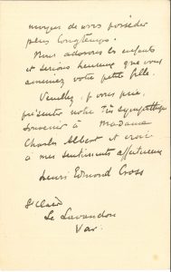 Henri-Edmond CROSS (1856-1910). L.A.S., Le Lavandou (Var) 23 janvier 1907, à un camarade [Charles Albert] ; 2 pages in-8 (petites fentes aux plis).