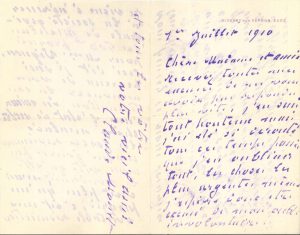 Je viens d’adresser à la Société générale de Meulan les 500f promis pour Mme Vignon. Ceci dit je suis heureux de vous annoncer la continuation du mieux dans l’état de notre chère malade [sa femme Alice]. Les forces reviennent chaque jour un peu moins vite qu’elle le voudrait, mais c’est plus qu’un progrès, c’est une véritable résurrection. Vous pensez si nous sommes tous heureux. Je vous adresse ces lignes à Paris, ne sachant pas où vous pouvez être avec cette vilaine coqueluche qui doit se passer vite avec le changement d’air ».