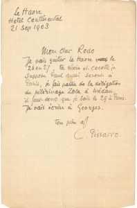 « Mon cher Rodo Je vais quitter Le Havre le 26 ou 27, ta mère et Cocotte je suppose Paul aussi seront à Paris, je fais partie de la délégation du pèlerinage Zola à Médan, il faut donc que je sois le 29 à Paris »…