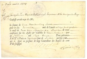 « Christophe Jean Baptiste Ballard seul imprimeur de la musique du Roy » reçoit 135 livres de rentes sur l’Hôtel de Ville.