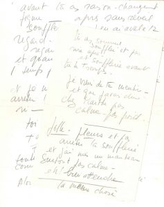 « Avant tu as raison – changement figure – après sans réveil soufflerie – j’en ai avalé 12 regard. – Regard avant et j’ai eu un rêve et quand j’ai su avant – pas 1 temps froid. Vivre. Pareil soufflerie et je ne sentais plus – ne pas arrêter l’action »...