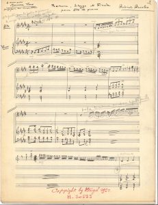 La partie d’alto présente en outre des doigtés et coups d’archet notés au crayon, ainsi qu’un collette pour la cadence. Ces manuscrits ont servi pour la gravure de l’édition chez Heugel en 1932.