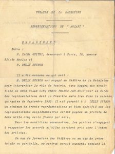 Traité d’engagement de Delly SEYBOR au Théâtre de la Madeleine, pour interpréter le rôle du danseur Vestris, dans Mozart, pour la reprise de septembre 1932, à 2500 francs par mois pour la durée des représentations.