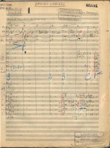 Le manuscrit, noté à l’encre noire sur papier à 30 lignes, présente quelques ratures et corrections ; exemplaire de location, il a servi de conducteur et porte de nombreuses annotations aux crayons bleu, rouge et vert, ainsi que des traces d’usage ; il a servi pour la gravure de la partition chez Heugel en 1950 et porte les cachets d’enregistrement à la SACEM en date du 14 janvier 1948.