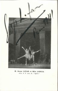 Photo de Serge Lifar et Mlle LORCIA dans le 3e acte de Sylvia, avec grande signature: