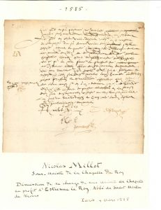 • Nicolas MILLOT, « soubs maistre de la chappelle du Roy » : démission de sa charge au profit d’Estienne Le Roy, abbé de Saint-Martin de Nevers (1585).