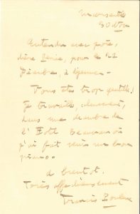 « Entendu, avec joie, chère Renée, pour le 21 décembre, à déjeuner. Vous êtes trop gentille ! Je travaille, calmement, dans une chambre de l’Hôtel Beauvau où j’ai fait venir un bon piano »…