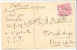 Giacomo PUCCINI (1858-1924). CARTE postale a.s. « G. », Bolzano [14 septembre 1909], à son agent d’affaires Antonio BETTOLACCI, à Torre del Lago ; au dos d’une carte postale illustrée en couleurs, adresse ; en italien (on joint une...
